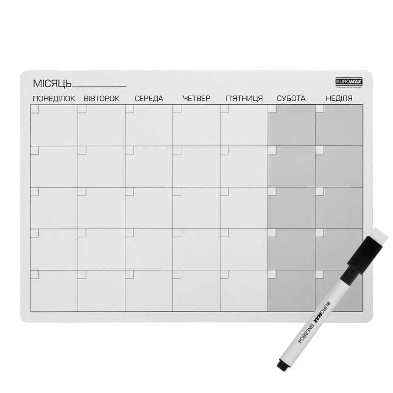 Комплект Настенный месячный магнитный планер + маркер от BUROMAX – современное удобное и эффективное решение для планирования и визуализации информации. Выполненный в классическом стиле, может использоваться в офисе, студии, на производстве, а также в быту. формат А3 (размер 425х305х5 мм) ориентация горизонтальная белая поверхность, имеет линирование в виде ячеек на каждый день месяца покрытие специальной ПЭТ-пленкой, пригодное для письма маркерами сухого стирания надписи стираются специальной губкой поверхность пригодна для многократного использования, не царапается, не создает неприятных скрипучих звуков при письме основа из магнитного винила для крепления планера на металлическую поверхность в комплект входит мини-маркер сухого стирания черного цвета, ширина линии письма 1-2 мм, с вмонтированной губкой для стирания и магнитом для крепления на металлической поверхности