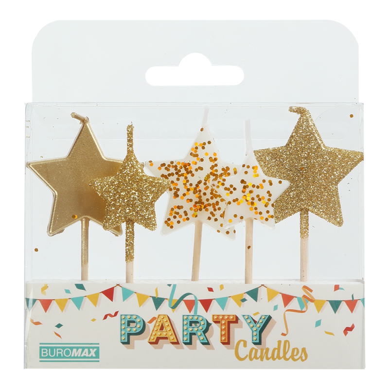 Свечи для торта "Звезда" от BUROMAX - это отличный способ подарить праздник, сделать праздник более ярким, незабываемым, подарить самые теплые эмоции. Такая свеча очень универсальна, подойдет для праздника как взрослых, так и детей. 5 шт. Форма звезды Размер свечи (ВхШхТ): 3,5х3,5х0,6 см Изготовлены из парафина Держатель из натурального дерева (4 см длина) Цвет свечей: золотой, белый с золотым глитером