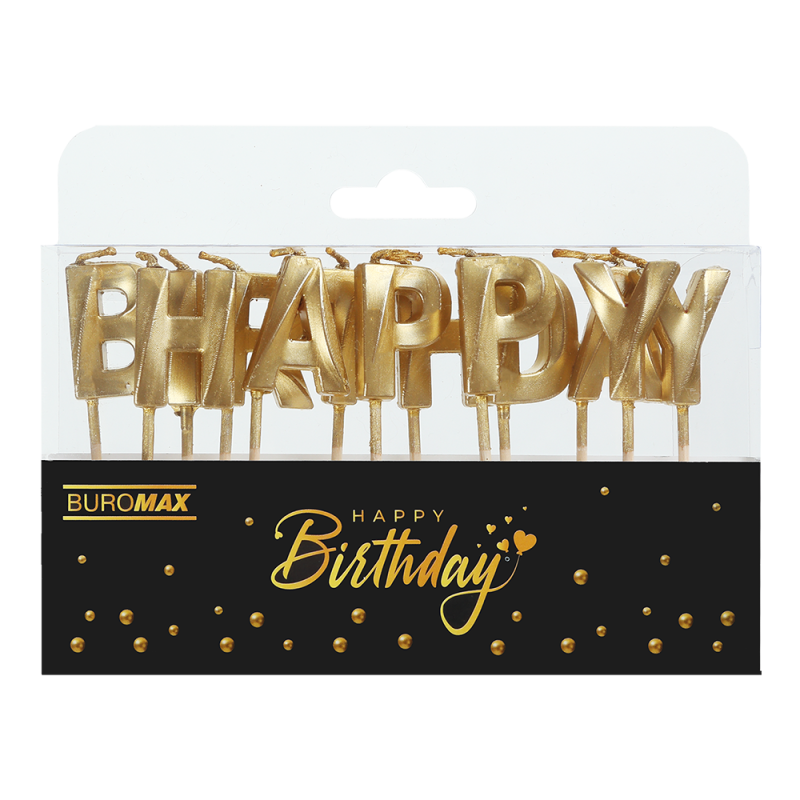 Свечи для торта от BUROMAX – это отличный способ подарить праздник, сделать праздник более ярким, незабываемым, подарить самые теплые эмоции. Такая свеча очень универсальна, подойдет для праздника как взрослых, так и детей. 13 шт. в виде английских букв, создающих надпись "HAPPY BIRTHDAY" Размер свечи (ВхШхТ): 2,8х2,2х0,8 см Изготовлены из парафина Держатель из натурального дерева (5 см длина) Цвет свечей: золотой