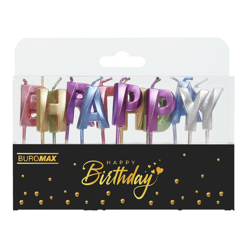 Свечи для торта от BUROMAX – это отличный способ подарить праздник, сделать праздник более ярким, незабываемым, подарить самые теплые эмоции. Такая свеча очень универсальна, подойдет для праздника как взрослых, так и детей. 13 шт. в виде английских букв, создающих надпись "HAPPY BIRTHDAY" Размер свечи (ВхШхТ): 2,8х2,2х0,8 см Изготовлены из парафина Держатель из натурального дерева (5 см длина) Цвет свечей: ассорти металлик