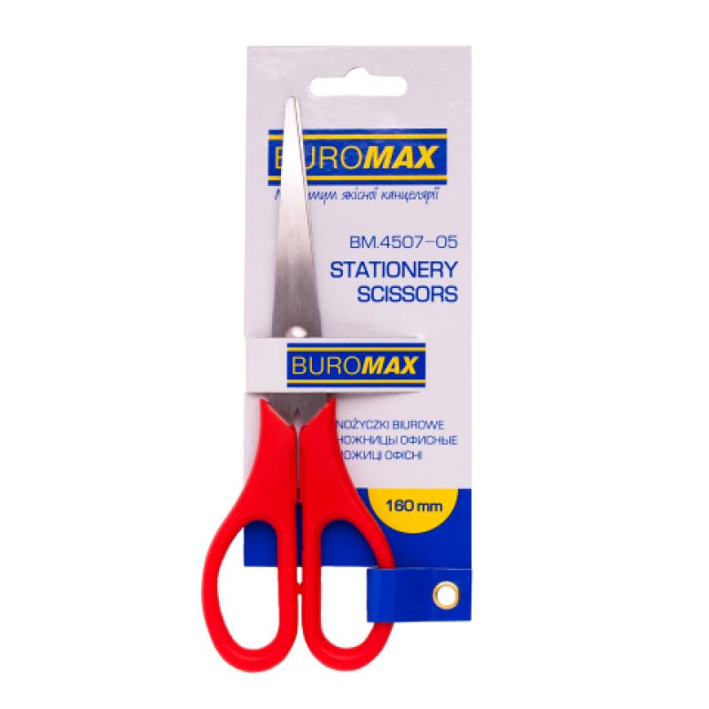 Офисные ножницы BUROMAX: подходят для резки бумаги, картона, фотобумаги, ткани и т.д. у ножниц плавный и мягкий ход резки закругленные лезвия изготовлены из нержавеющей стали, и гарантируют безопасность во время резки ручки выполнены из пластика цвета: черный, зеленый, красный, синий, серый эргономичная форма ручек обеспечивает комфорт во время работы индивидуальная картонная подложка длина ножниц: 160 мм Ножницы BUROMAX – это качество и надежность!